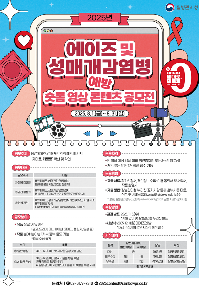 [질병관리청] 에이즈 및 성매개감염병 예방 숏폼 영상 콘텐츠 공모전(~8/31)