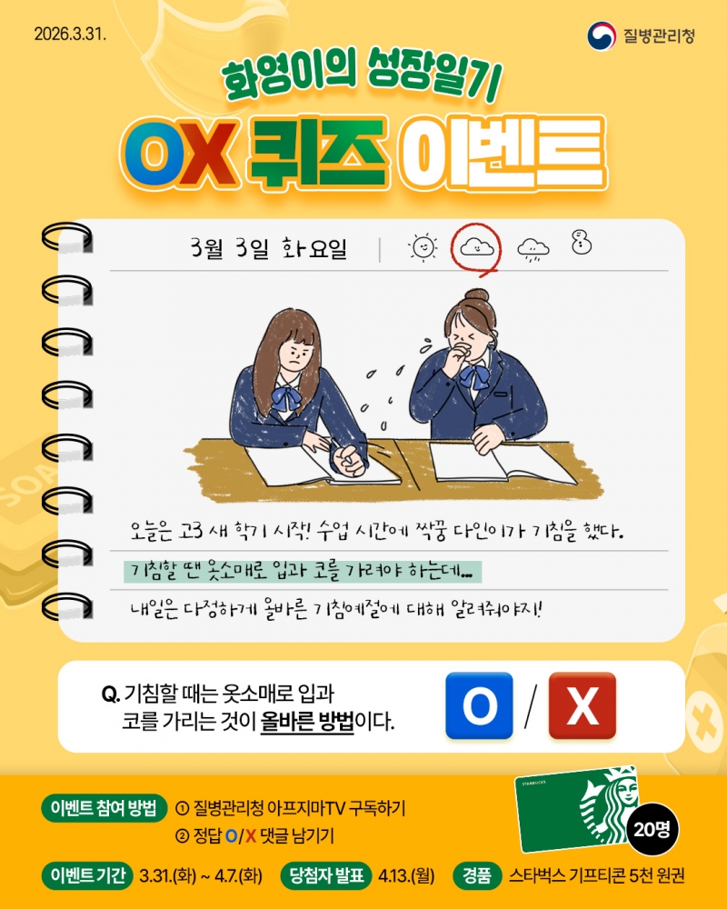 [성장일기] EP1. 건강에 예민한 화영이의 여고생활 ? <화영이의 성장일기> 시청하고 퀴즈 맞히면 추첨을 통해 ?선물?을 드립니다! Q. 기침할 때는 옷소매로 입과 코를 가리는 것이 올바른 방법이다? O/X ✔정답을 댓글로 남겨주세요!? ? 이벤트 기간: 3.31.(화) ~ 4.7.(화) ? 당첨자 발표: 4.13.(월), 질병관리청 아프지마TV 커뮤니티 ✍ 참여 방법: 질병관리청 아프지마TV 구독 & 영상 시청 후 퀴즈 정답 댓글 남기기 ? 이벤트 경품: 스타벅스 기프티콘 5천 원권 (20명) ⚠ 주의사항 ⚠ • 유튜브 커뮤니티 댓글은 참여로 인정되지 않습니다. ❌ • 댓글 이벤트 참여는 오직 해당 영상에서만 가능합니다! ?? 영상 보러가기: https://me2.kr/jaLzp