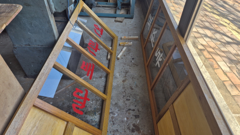 100% 수작업 레터링: 유리창의 '신속배달', '구두닦음' 문구는 시트지가 아닌 붓으로 직접 써 내려가 아날로그 특유의 질감과 입체감을 살렸습니다.