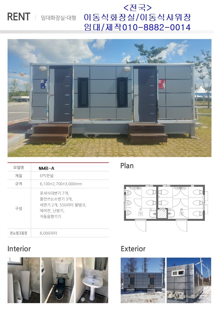 야외 행사/축제(준공식/체육행사) 및 야외(건축 및 기초공사) 현장에 사용될 다양한 화장실 및 샤워장 보유하고 있습니다.