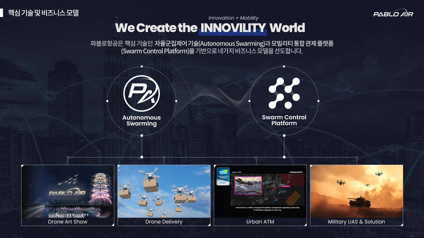 핵심 기술인 자율군집제어기술과 모빌리티 통합 관제 플랫폼을 기반으로 드론아트쇼, 국방 기술, 물류 배송 분야에 혁신을 일으키는 것을 기술 목표로 삼고 있습니다.