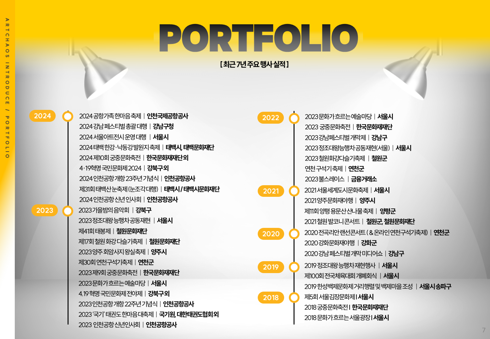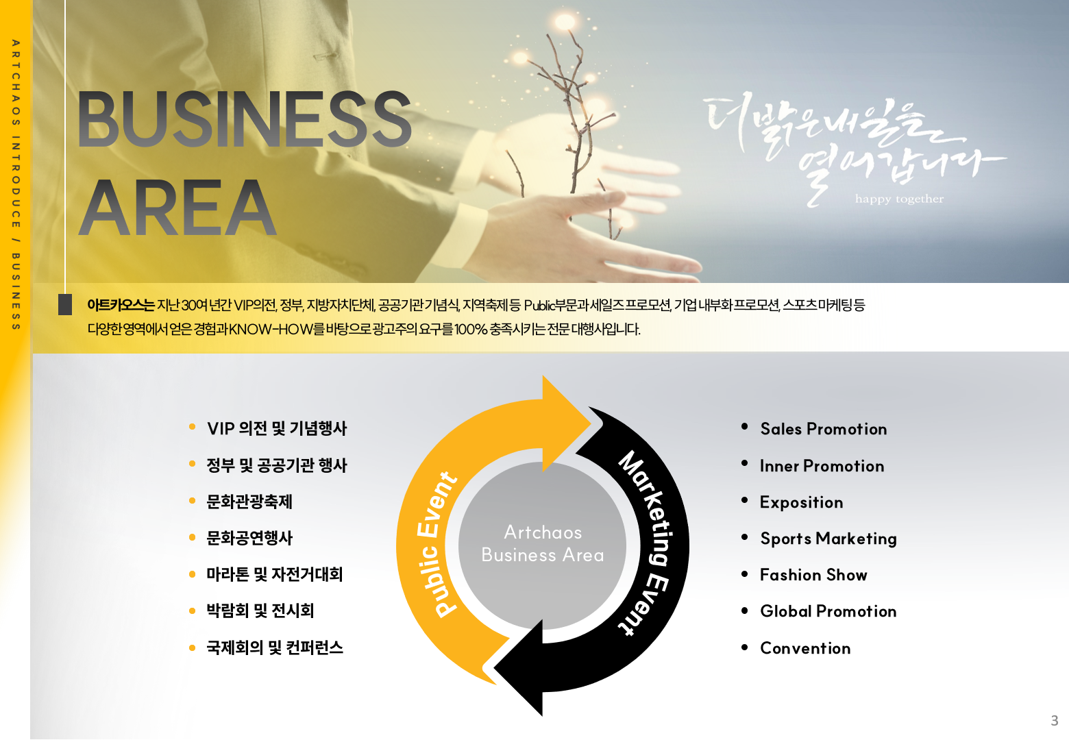 문화·공연 행사 기획, 프로모션 기획, 지역축제 기획 컨설팅, 전시·박람회 연출 및 기획 운영, 정부 행사 및 국제 대회 운영