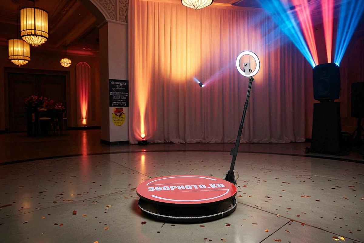 카메라가 원형 플레이트를 중심으로 360도 회전하며 촬영하는 포토(영상)부스
