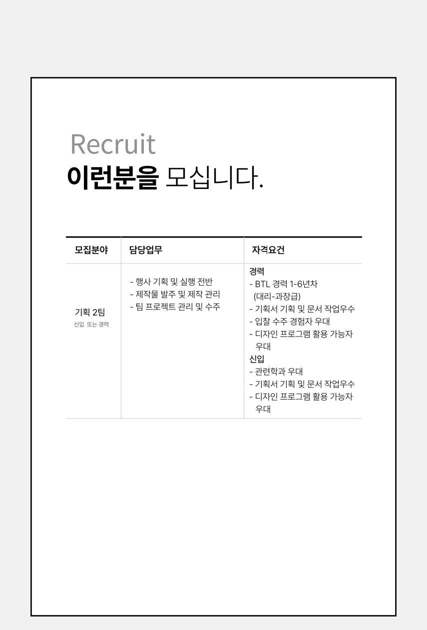채용 분야 | 기획팀 신입 or 경력 충원 |