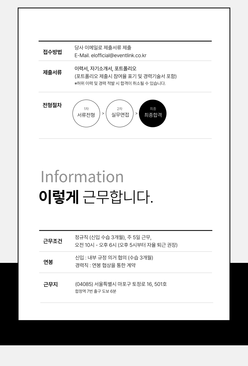 상세 요강 | 이력서 및 제안서, 포트폴리오 제출 필수 : elofficial@eventlink.co.kr |