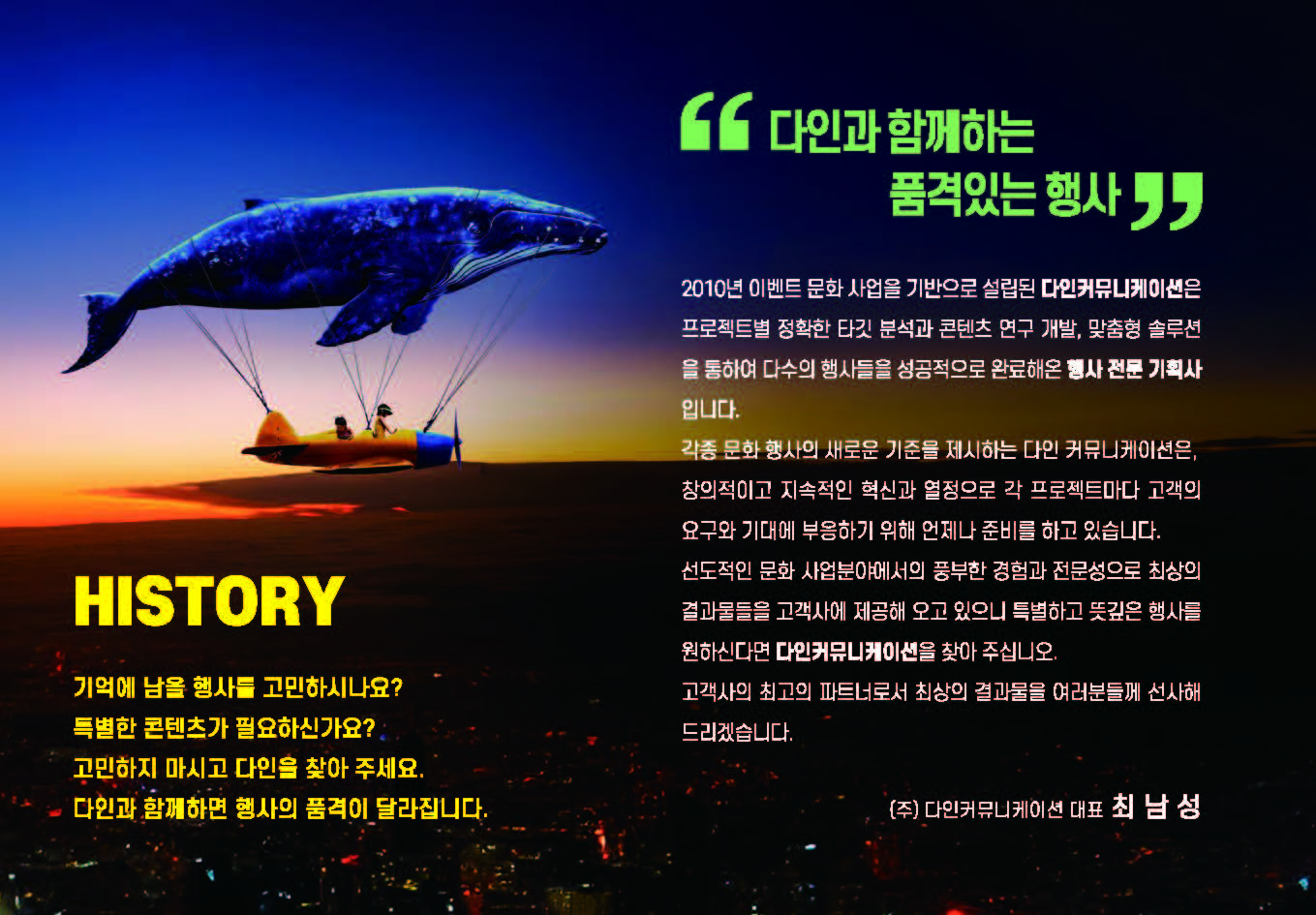 행사기획, 전시, 공연, 지역축제, 광고디자인 등 하이브리드 행사를 기획하여 행사의 품격을 높이는데 기여하겠습니다.