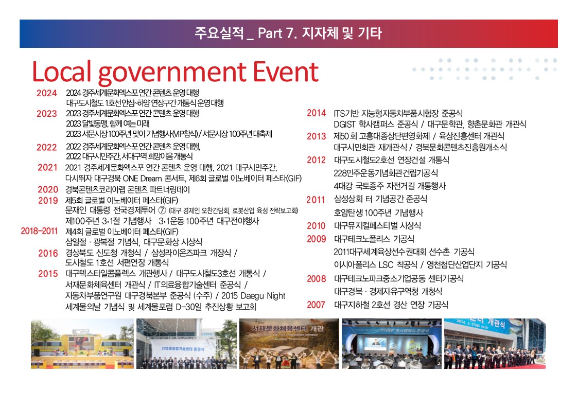 공공기관 문화 예술 축제 행사부터 국제 대회에 이르기까지 30년간 분야별 다양한 행사를 수행해 온 전문 행사 기획 운영 대행사
