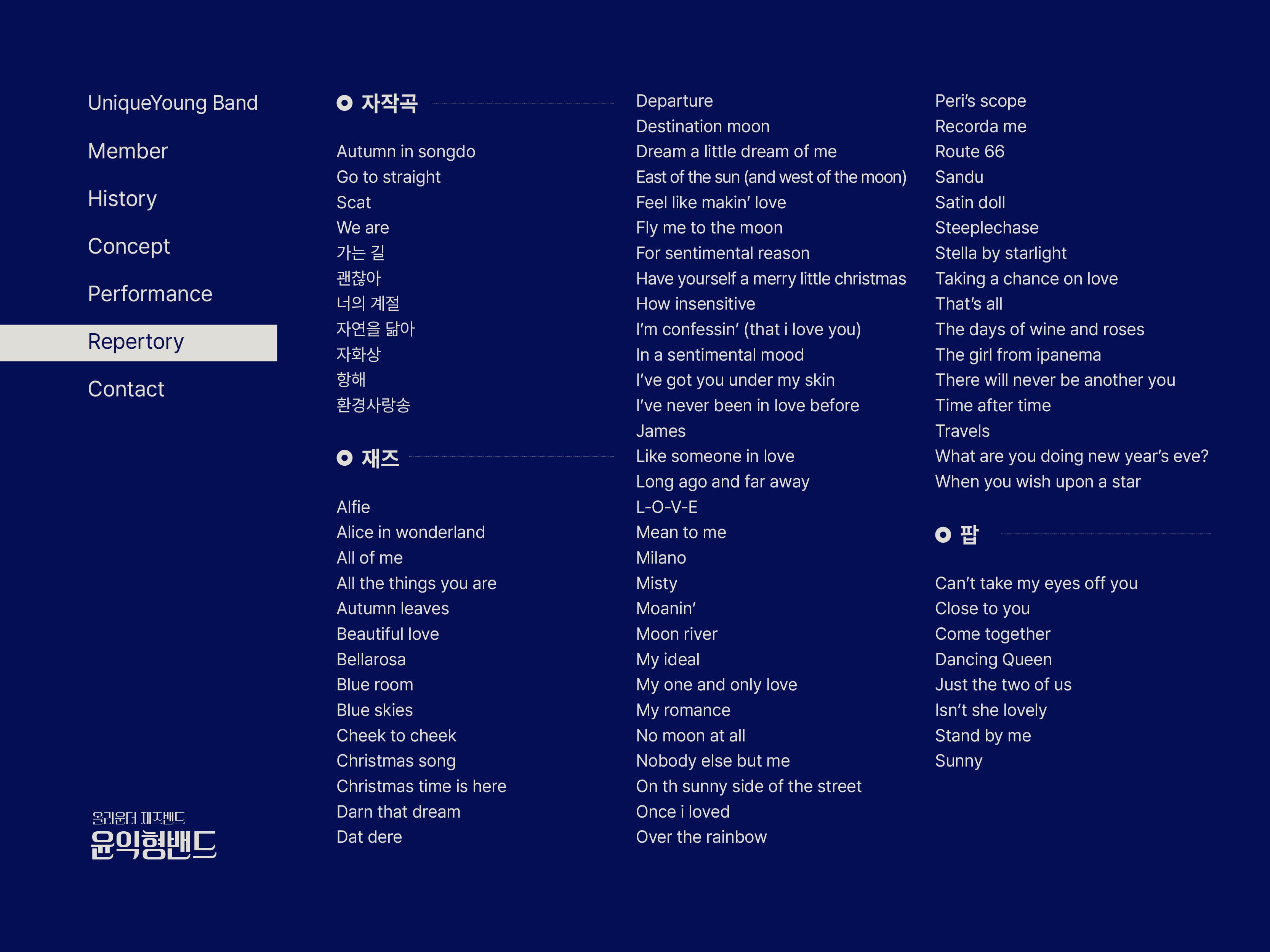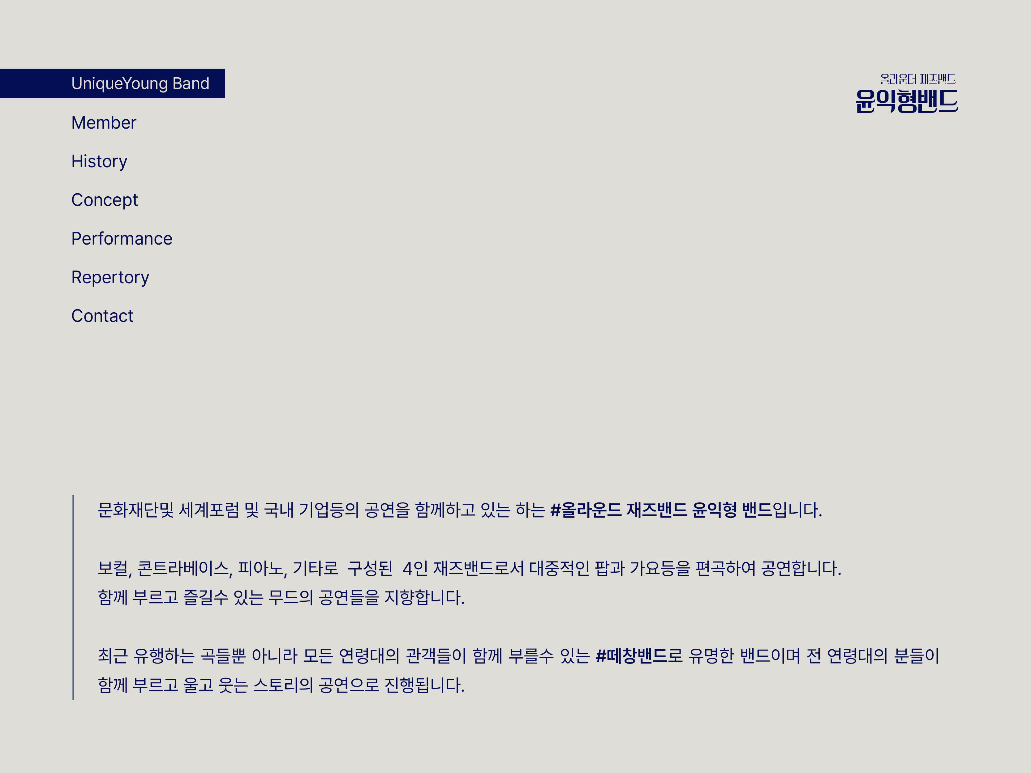 올라운더 밴드 문화재단및 세계포럼 및 국내 기업등의 공연을 함께하고 있는 하는 윤익형 밴드입니다 보컬 콘트라베이스 피아노 기타 의 4인 밴드이며 재즈부터 잘 알려진 팝과 가요등을 편곡하여 공연을 진행하며 함께 부르고 즐길수 있는 무드의 공연들을 진행하고 있습니다 모든 연령대의 관객들이 함께 부를수 있는 떼창밴드로 유명한 밴드이며 전 연령대의 분들이 함께 부르고 떼창할수 있는 스토리의 공연으로 진행됩니다