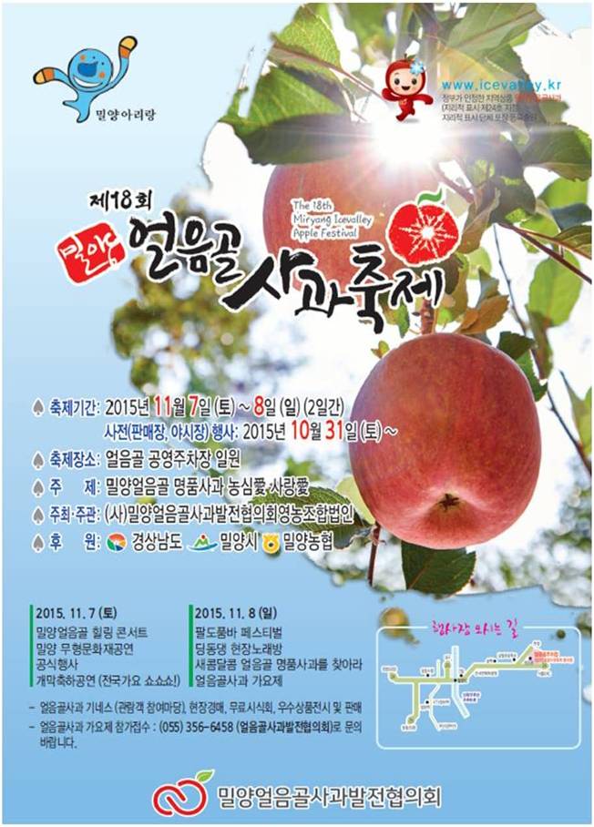 오는 월 일일 일간 밀양시 산내면에서 제회 밀양얼음골 사과축제를 개최하게 됩니다 주요행사는 월 일토 부터 사전행사인 판매행사 및 풍물야시장 행사를 시작으..
