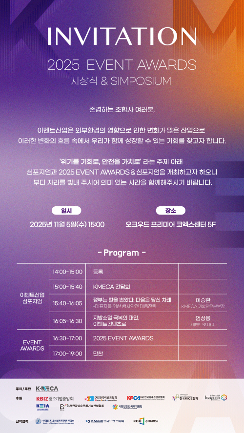 심포지엄 이후에는 2025 이벤트어워즈 시상식이 이어지며, 산업 발전에 기여한 기업과 인물들이 선정될 예정이다.