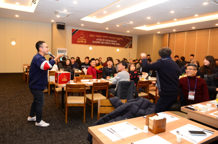 ‘협력업체 분들이 도와주셔서 2019년에는 돈을 많이 벌었고, 2020년도 돈을 많이 벌 수 있도록 도와주세요’라는 김재훈 대표의 인사로 송년회는 시작되었다. 직원들의 큰절도 있고~