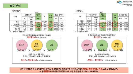 회귀분석을 통해 진주남강유등축제 유료방문객의 만족도가 재방문 및 추천의사에 미치는 요인은 콘텐츠, 편의서비스, 비용으로 도출되었으며, 이 중 콘텐츠가 재방문 및 추천의사에 가장 큰 영향을 미치는 것으로 나타남.