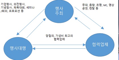 행사주최자인 기업, 공공기관, 협회, 단체 등에서는 행사대행을 하는 기획회사가 필요하다. 또한 소위 협력업체라는 군도 필요하다.