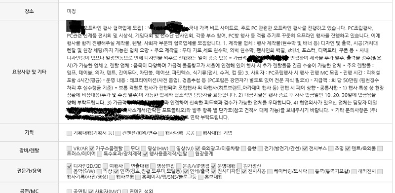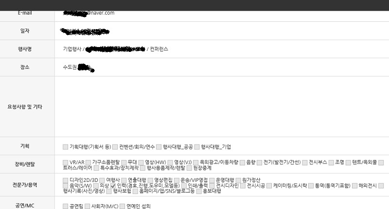 내가 필요한 회사 혹은 용역이 필요한 경우 해당코너에 들어가서 작성을 하면 된다. 행사명, 날짜, 내용 등을 작성하면, 해당 품목의 회사 담당자에게 이메일이 간다. 이메일을 받아 본, 담당자는 서로간의 연락을 통해 거래를 기대하면 된다.