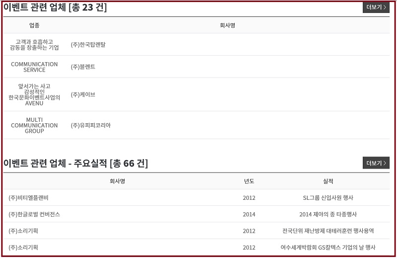 이벤트회사 및 관련업체의 경우 행사실적이 그 회사를 검증할 수 있는 검색에서 '행사'를 검색한 경우(이 곳을 클릭하면 실제 검색 화면으로 넘어갑니다) |