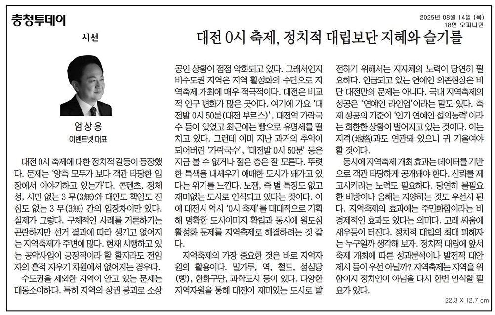 [기고_충청투데이]대전 0시 축제, 정치적 대립보단 지혜와 슬기를~!!