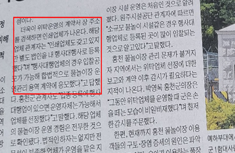 내용은 이렇다. 홍천물놀이장 운영 업체 선정에 있어서 A라는 회사가 선정이 되어 운영을 했는데 ‘이상 증세’가 나타났다. 알고보니 이 회사는 주 업이 인쇄업체로 행사경험이 전무한 회사다.