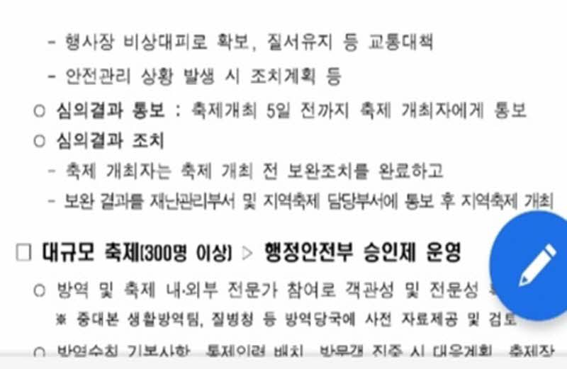 행정안전부는 행사 관련 안전관리계획지침을 각 지자체, 공공기관으로 보내 실질적으로 행사취소를 권하는 것으로 행사대행업계에 치명적인 피해가 예상되고 있다. 안전관리계획 심의 내용에 의하면 50명 미만, 300명 미만의 경우 ‘대면 축제 최대한 취소’또는 비대면 권장이고 300명 이상은 행안부 승인 후 개최인데 “불승인 원칙”이라고 되어 있어 결국 300명 이상은 취소하라는 내용으로 볼 수 있다.