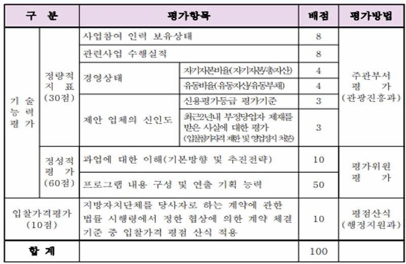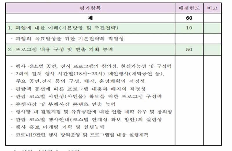 여기에 기술적 평가 기준이 다소 황당하다. 배점한도가 60점인데, 과업에 대한 이내(10)이고 나머진 프로그램 내용 구성 및 연출 기획능력이 50점으로 되어 있다. 대체적으로 구분이 되어 10, 5, 20점 등으로 나눠지는데 이번은 전체50점으로 산정하는 방식이다. 유사 행사대행 입찰공고에 있어 거의 초유의 배점항목이라는 표현을 써도 무방할 정도이다.