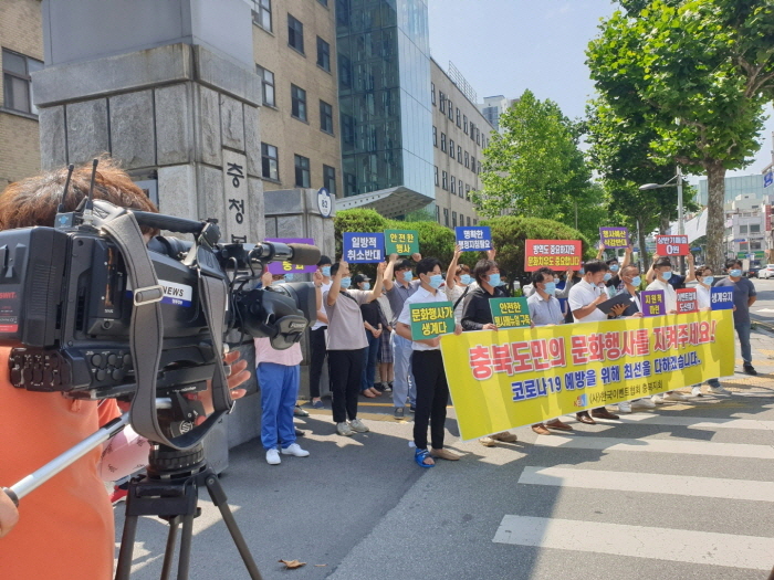 지난 623일 한국이벤트협회 충북지회는 23"신종 코로나바이러스 감염증(코로나19) 방역도 중요하지만 도민들의 문화적 치유 차원에서 계획했던 지방자치단체 행사를 개최해 달라"고 호소문을 발표하고 충북도청앞에서 기자회견을 열었다.