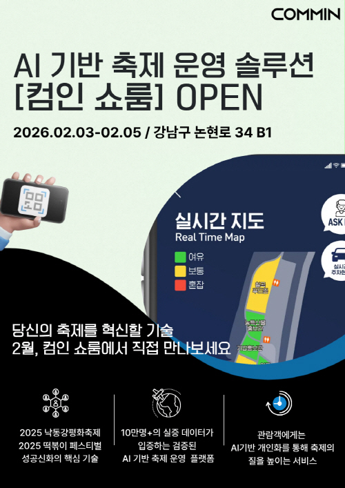 한편, 컴인은 오는 2월 3일부터 5일까지 3일간 강남에서 운영자와 관계자를 대상으로 한 쇼룸을 오픈할 예정이다. 이번 쇼룸에서는 10만 실증 데이터를 기반으로 도출된 AI 분석 대시보드와 실제 운영 프로세스를 직접 시연하며, 축제 산업의 미래를 직접 경험할 수 있는 자리가 마련될 것으로 보인다.