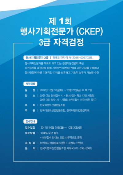 한국이벤트산업협동조합(이하 ‘조합’)에서는 2017년 행사기획전문가(CKEP) 1급과 2급 자격검정을 성공적으로 개최하였다. 이것에 이어 10월 중 ‘제 1회 행사기획전문가(CKEP) 3급 자격검정’을 개최한다.
