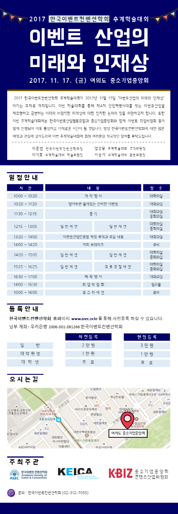 한국이벤트컨벤션학회는 오는 11월 17일 금요일 10시부터 17시까지 여의도 중소기업중앙회 2층 릴리홀과 회의실에서 '이벤트 산업의 미래와 인재상'이라는 주제로 추계학술대회를 진행한다.