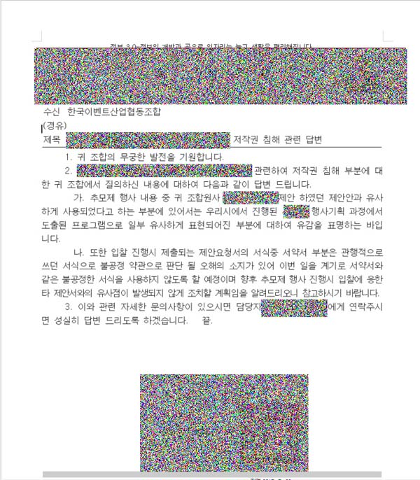 한국이벤트산업협동조합 조합사의 입찰제안서 저작권 침해 피해 해당 공공기관에 건의