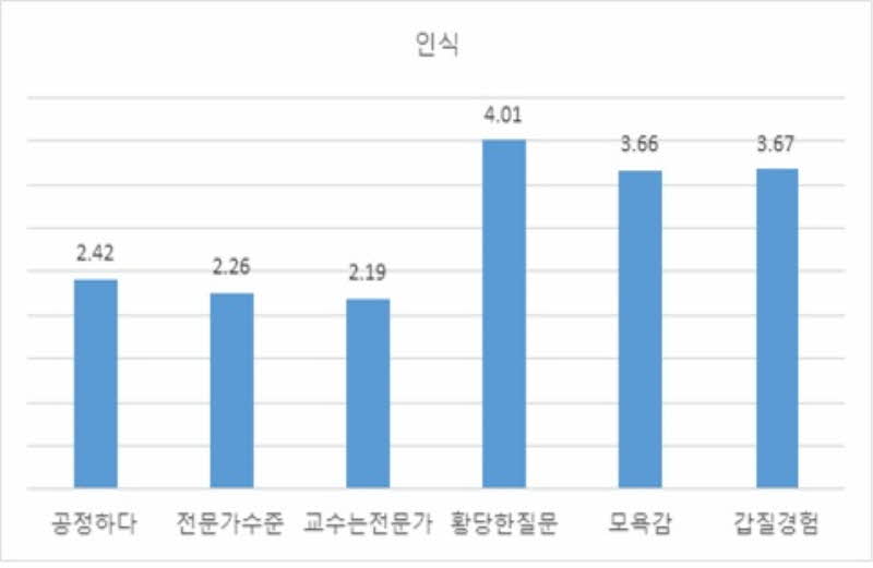 ‘심사위원에 대한 인식’에 있어서는 ‘내용과는 관계없는 황당한 질문을 하는 경우가 있다’가 4.01로 가장 높게 나타났으며 ‘갑질경험’을 당해봤다(3.67), 모욕감을 느낀적이 있다(3.67), 공정하다(2.42), 심사위원은 전문가 수준이다(2.26), 교수는 전문가다(2.19)순으로 나타났다. 내용과 관계없는 질문을 하는 경우가 많다는 것은 그만큼 행사용역에 참여하는 심사위원이 ‘전문성’과는 다소 거리가 있다는 것을 알 수 있다.