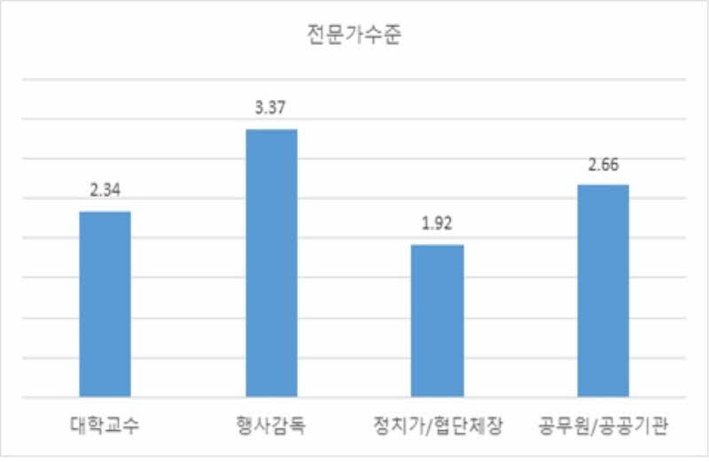 ‘심사위원의 전문성’에 있어서는 ‘행사감독’(3.37)‘이 가장 높게 나타났고 ’공무원/공공기관‘(2.66), ’대학교수‘(2.34), ’정치가/협,단체장‘(1.92)순으로 나타났다.