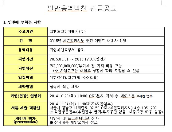 그랜드코리아가 주관하는 ‘2015세븐럭카지노 연간이벤트대행사 선정’에 있어 시작부터 마무리까지 석연치 않은 내용으로 업계의 의심을 사고 있다. 최초 입찰에 있어 ‘긴급입찰공고’라는 형식을 취한 점과 ‘ ‘대행수수료’에 대한 배점 등이다.