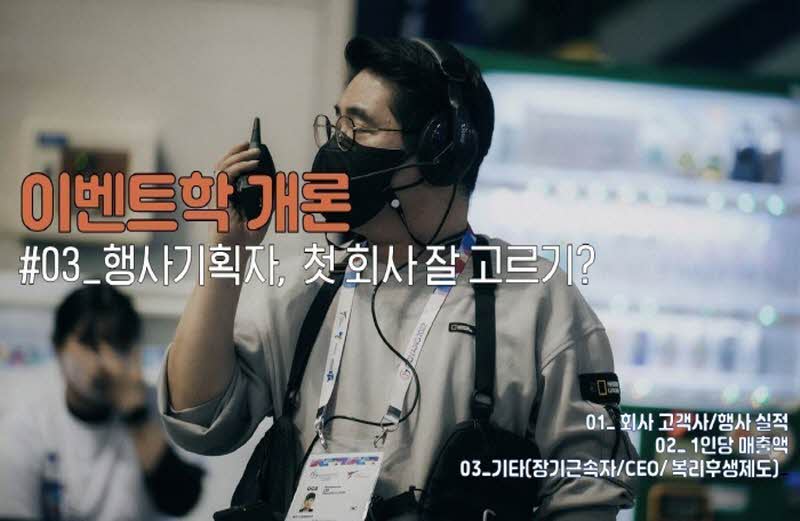 모든 업종이 첫 선택이 중요하지만, 행사기획자의 경우에는 특히 중요합니다. 이벤트회사에 따라 공공행사, 기업행사를 전문으로 하는 경우가 있습니다. 대체적으로는 두 개를 병행하는 회사가 많이 있습니다.