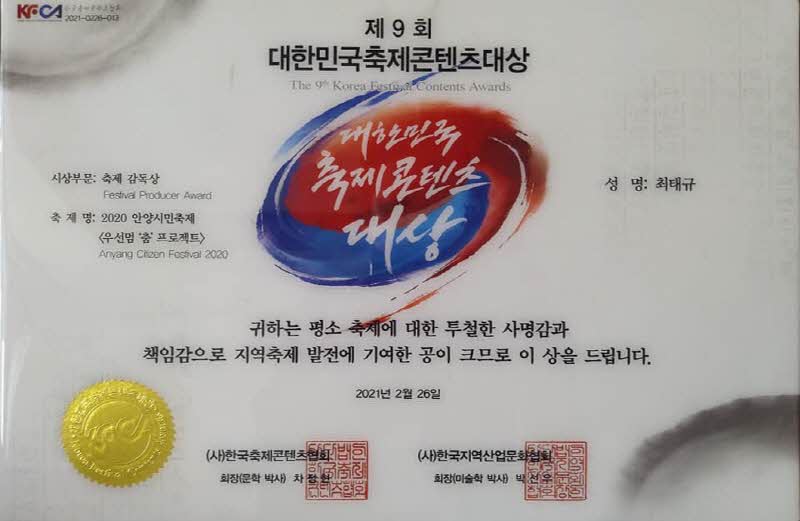 )한국축제콘텐츠협회'가 주최하는 '9회 대한민국축제콘텐츠 대상' 시상식이 지난 330330일 안양시청에서 개별 진행을 했다. 이 자리에서 최태규 감독(상상공장 대표)'안양시민축제' <우선멈''프로젝트>'올해의 축제감독상'을 수상했다.