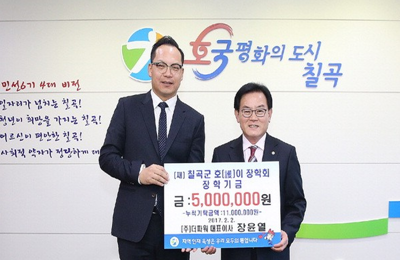 ㈜더파워 장윤열 대표는 최근 칠곡군 지역인재육성과 교육발전을 위해 써달라며 (재)칠곡군호이장학회에 호이장학금 500만원을 기탁했다. ㈜더파워는 대구 수성구 소재 이벤트 및 프로모션 업체로 2016년 제4회 낙동강세계평화문화대축전 총괄 대행했으며 수익금의 일부를 칠곡군 인재양성을 위해 기부했다.
