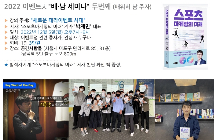이벤트넷 이벤트인 세미나가12월5일 서울 공덕동에 위치한 공간사람들에게 19시부터 열린다. ‘스포츠마케팅의 미래’ 의 저자인 박재민 대표의 강의로 2시간 동안 진행된다. 이벤트업 관계자라면 누구나 신청과 참가가 가능하다. 지난 11월 첫 번째 모임이후 2번째로써 향후에 다양한 주제로 매월 세미나를 열 계획이다.