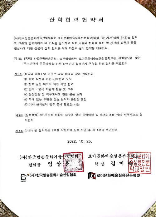 한국방송문화기술산업협회(회장 엄상용, 이하 ‘BITA’)와 로이문화예술실용전문학교(학장 김미숙)는 상호교류와 협력을 위해 MOU를 체결했다. 산학협력을 도모하는 취지로 한 MOU는 일반적인 형식적인 내용을 탈피하여 실질적이고 구체적인 협력을 중점적으로 시행하기로 하여 우선 11월부터 BITA의 협회사 임원 및 직원으로 구성된 강사진이 출강하여 현업에 대한 강의를 한다.