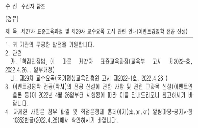 이벤트경영학 전공이 교과목 신설로 인증을 받아서 지난 4월26일부터 시행되었다. 간단하게 얘기하면 이벤트경영학이 학점 인정이 됨에 따라 평생교육과정으로 정식 체택 되었다는 의미가 있다.