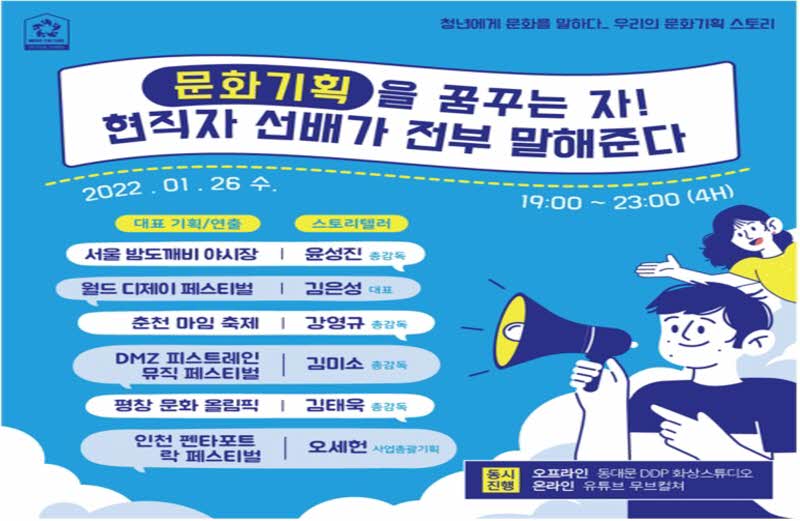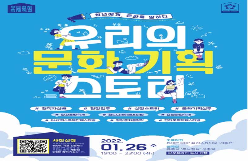 일시: 2022년 1월 26일 (수) 19:00 – 23:00 (4h) 장소: 온오프라인 동시 진행 - 오프라인: 동대문 DDP 화상스튜디오 ‘서울온’ - 온라인: 유튜브 ‘무브컬쳐’ 생중계 신청: 100% 사전 신청제, 현장 신청자는 추첨을 통해 선정 주최: 무브컬쳐 축제학교