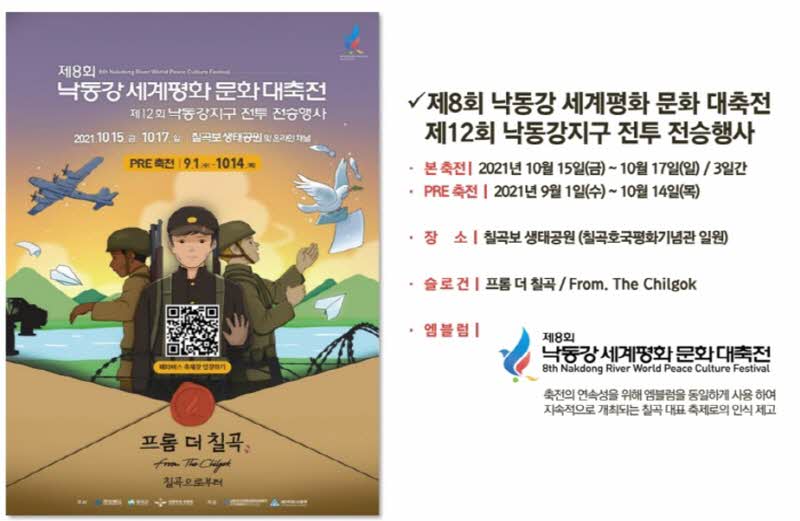 Pre축전에는 예술을 배달하는 버스, 칠곡 다크투어, 기념관이 살아있다, XR스튜디오, 메타버스 축전장으로 꾸며지고 1015일부터 17일까지는 본 축전장이 칠곡보 생태공원에서 펼쳐진다.