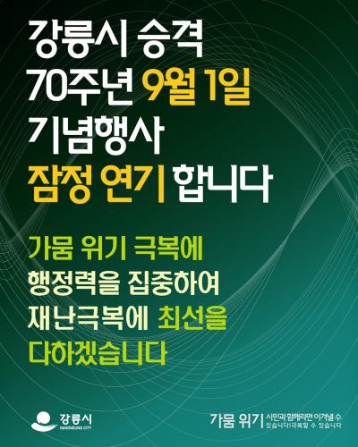 강릉시는 시 승격 70주년을 기념해 9월 1일 개최 예정이었던 「강릉시민의 날」 기념행사를 잠정 연기했다. 강릉하키센터 야외광장에서 기념식, 시민대상 시상, 경축 공연 등을 계획했으나, 제한급수 조처 등 주민 생활의 어려움이 가중되고 있어 “행정력을 재난 극복에 집중하는 것이 바람직하다”는 판단 아래 이번 결정을 내렸다